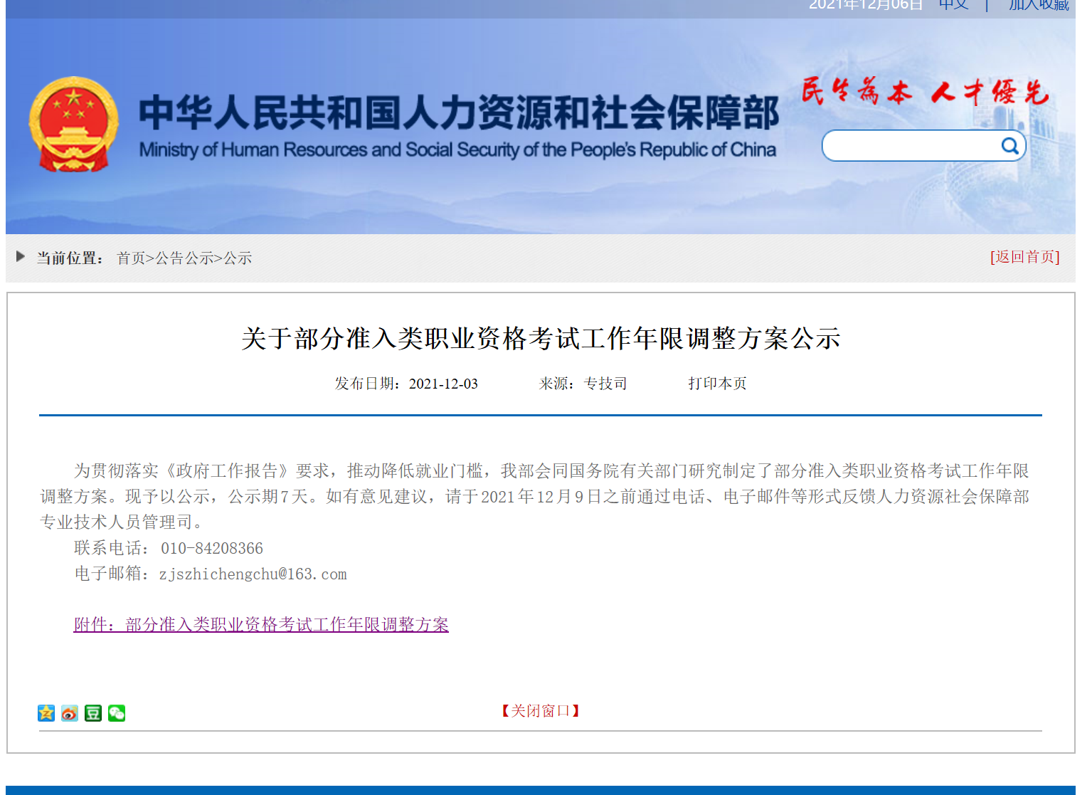 (2021年12月6日)建凱造價(jià)部整理發(fā)布《關(guān)于部分準(zhǔn)入類職業(yè)資格考試工作年限調(diào)整方案公示》