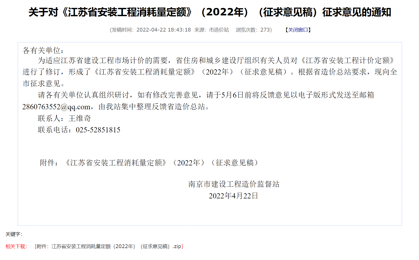 轉(zhuǎn)發(fā)關(guān)于對(duì)《江蘇省安裝工程消耗量定額》(2022年) (征求意見稿) 征求意見的通知,其下載鏈接如下所示: