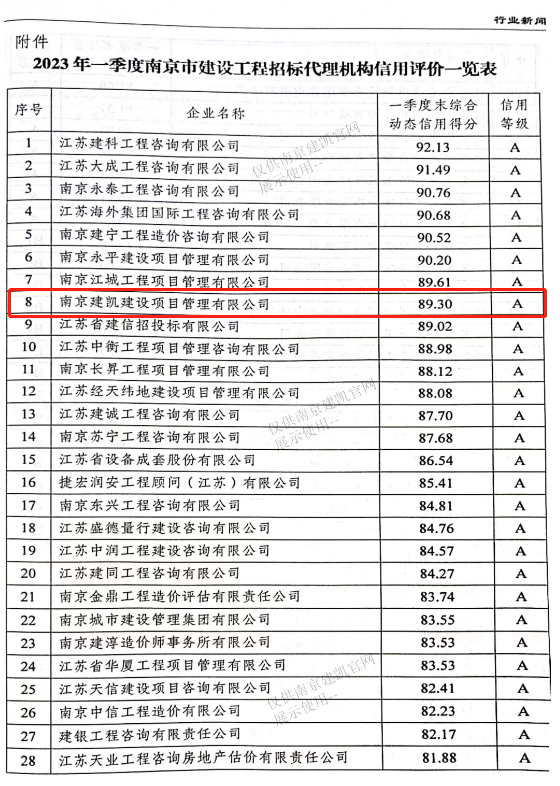 熱烈祝賀我司招標代理機構在2023年第一季度南京市建設工程招標代理機構信用評價(jià)綜合得分89.30分,全市排名第八名