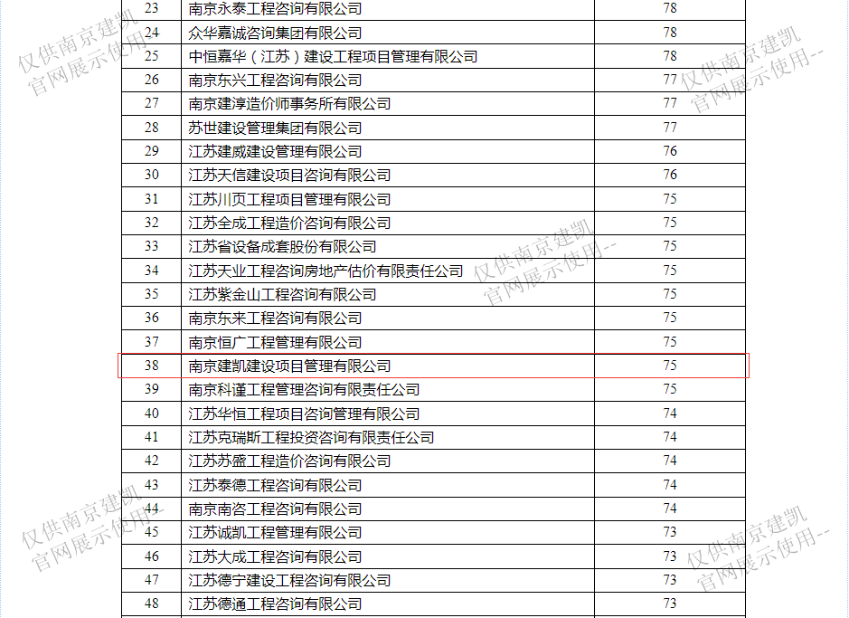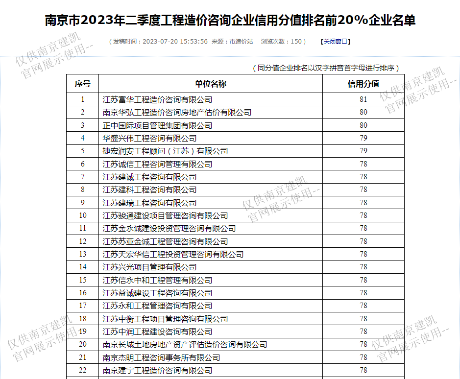 恭喜我司入選“南京市2023年二季度工程造價(jià)咨詢(xún)企業(yè)信用分值排名前20%企業(yè)名單”