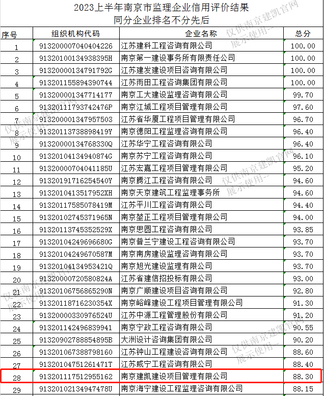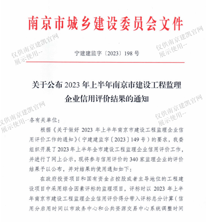 我司監理企業(yè)在2023年上半年南京市建設工程監理企業(yè)信用評價(jià)綜合得分88.30分