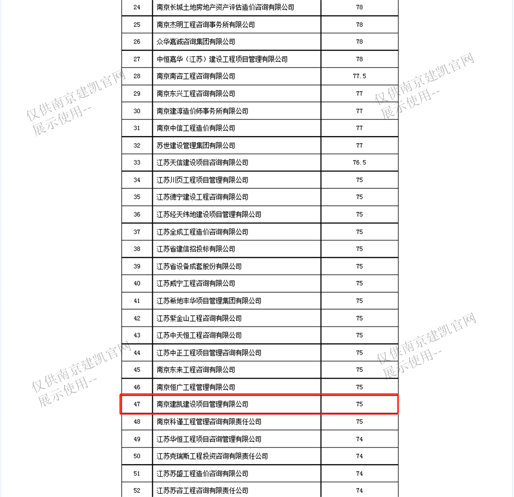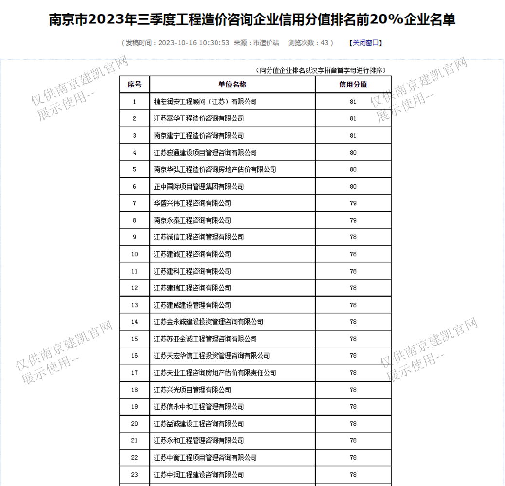 恭喜我司入選“南京市2023年三季度工程造價(jià)咨詢(xún)企業(yè)信用分值排名前20%企業(yè)名單”