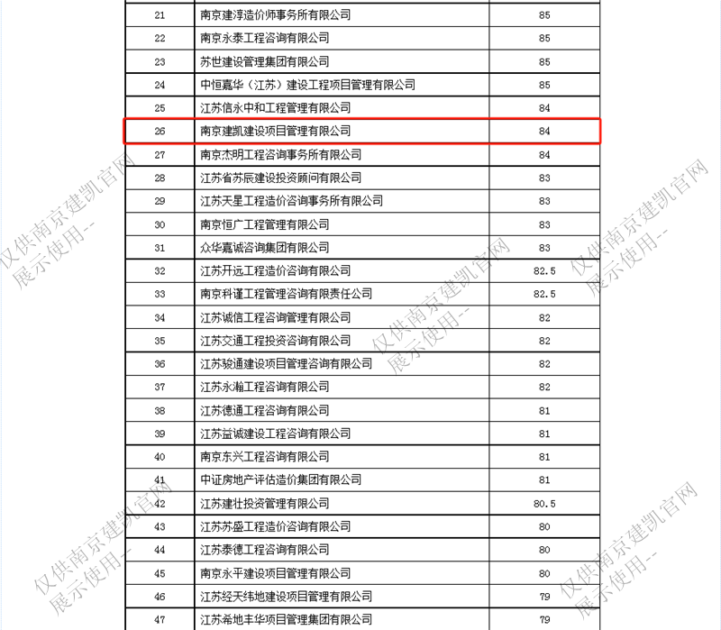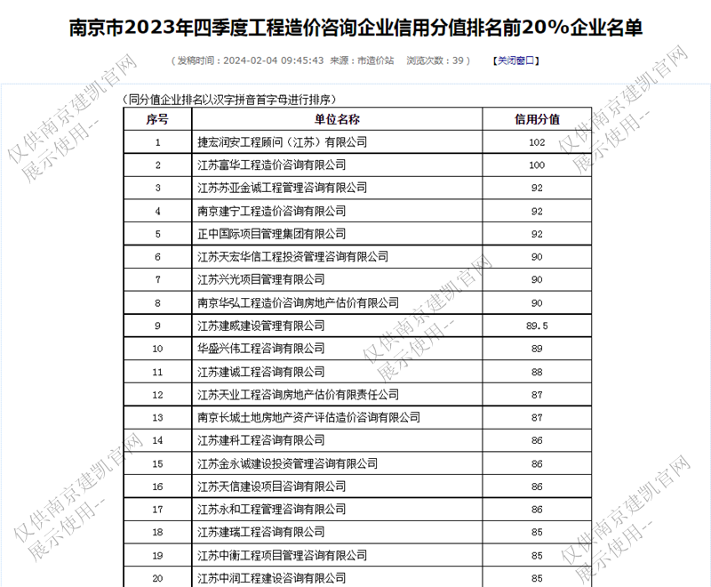 恭喜我司入選“南京市2023年四季度工程造價(jià)咨詢(xún)企業(yè)信用分值排名前20%企業(yè)名單”